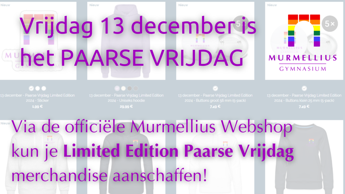 Op vrijdag 13 december vieren we landelijk Paarse Vrijdag. Op onze Murmellius Webshop kun je nu een Limited Edition Paarse Vrijdag artikel aanschaffen.