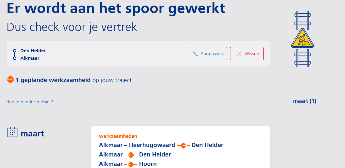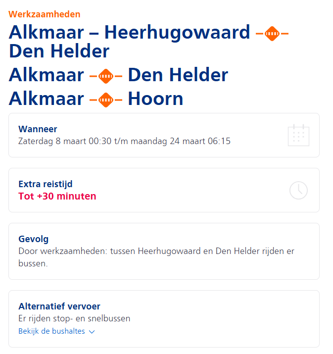 Tussen 8 en 24 maart rijden er tussen Den Helder en Heerhugowaard bussen in plaats van treinen.
